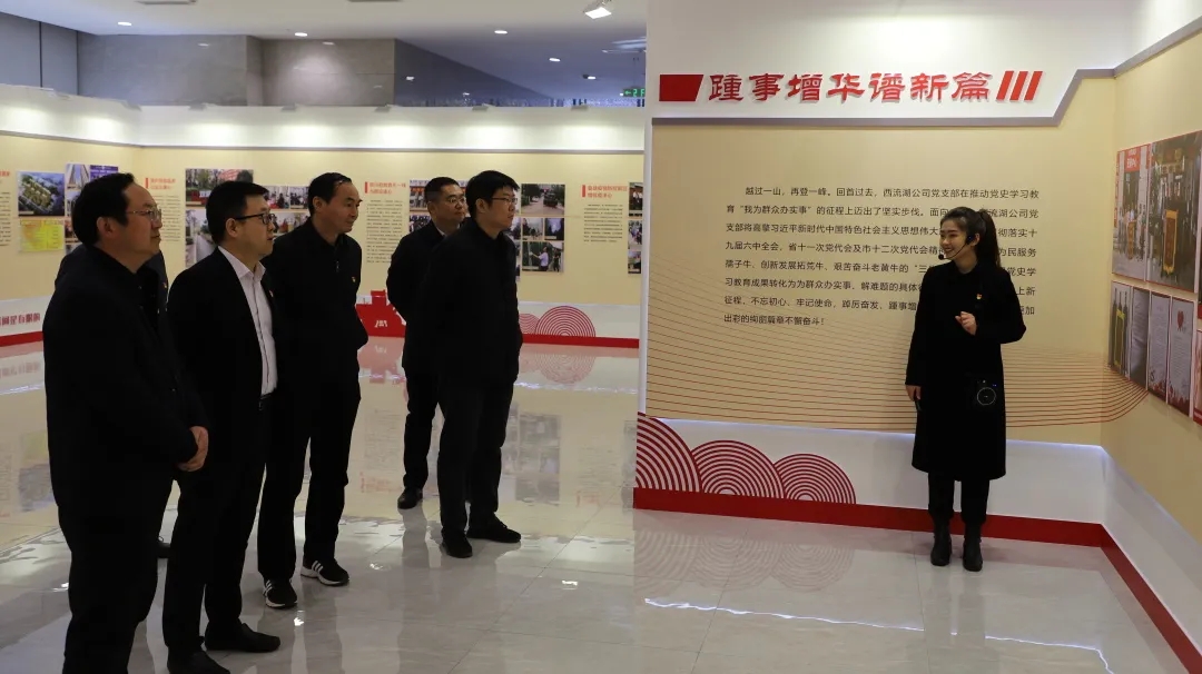 第二站,指導組一行參觀了金岱科創(chuàng)城商務服務中心,詳細了解了金岱科創(chuàng)城核心板塊、商代王城遺址核心板塊及小李莊火車站核心板塊的規(guī)劃建設情況。隨后實地觀摩了西流湖公司黨支部黨史學習教育“我為群眾辦實事”主題展,對西流湖公司黨支部助推金岱迭代升級、全力打通“斷頭路”、打造精品安置房、積極投身防汛搶險疫情防控一線等踐行“八心”服務、為群眾辦實事好事的一系列工作舉措給予了高度評價和充分肯定。